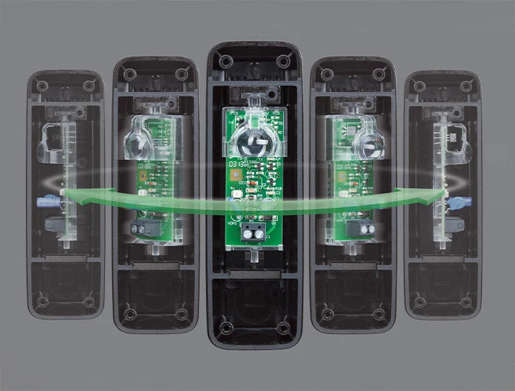 The photocell is housed on a rotating support equipped with a high-performance lens designed to optimize the efficiency of the beam in any direction.
